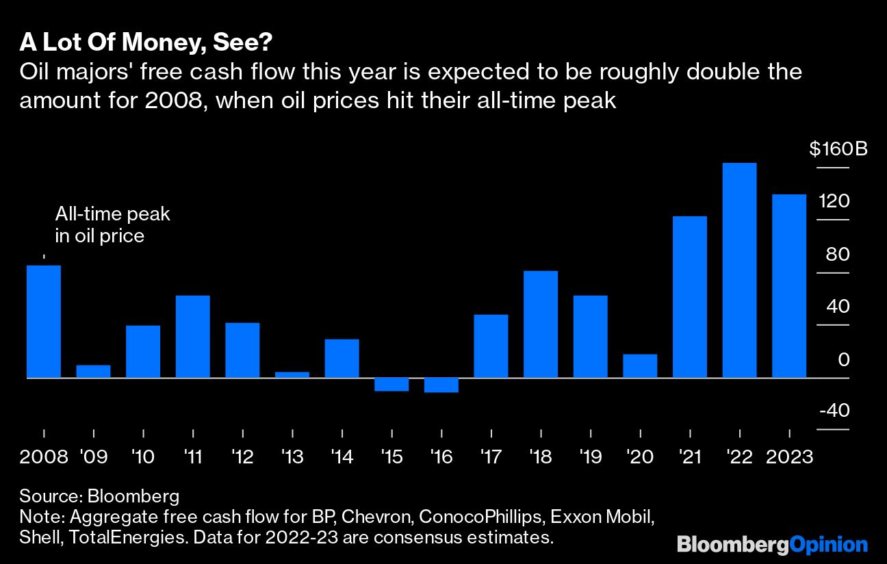 For energy investors, this combination of a 7% payout yield plus continued deleveraging — the polar opposite of what they got for much of recent history — is about as good as it gets. With consensus estimates pointing to free cash flow of almost $140 billion in 2023, the industry could repeat the trick next year.
