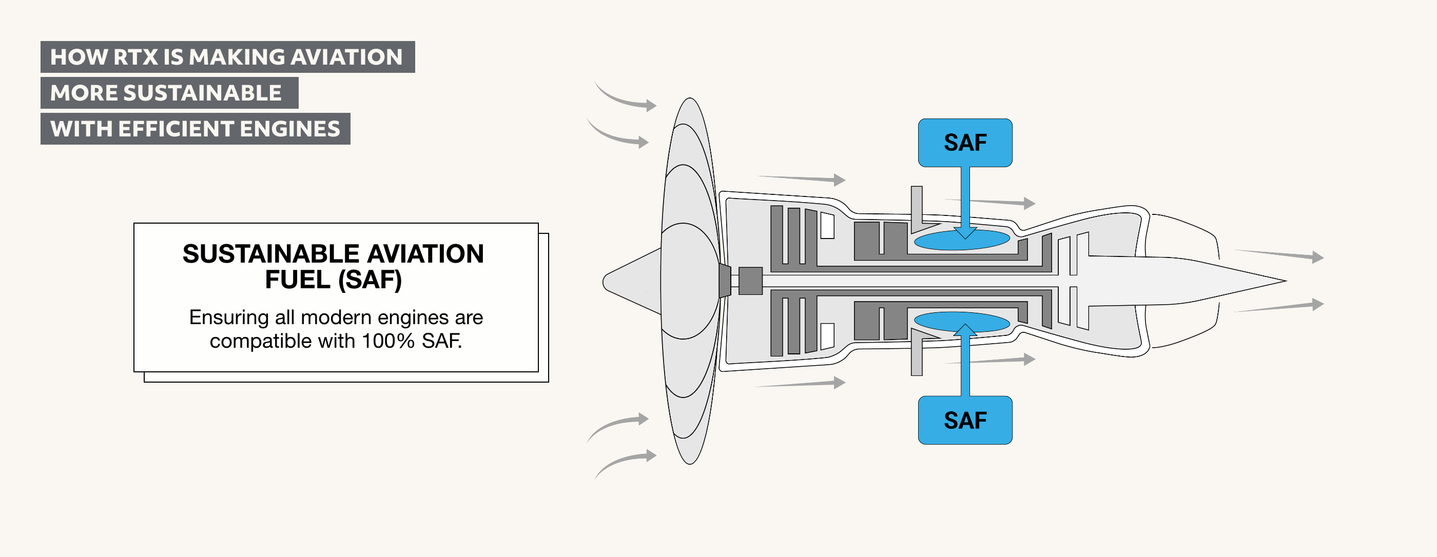 In anticipation of increased SAF availability in the upcoming years, Pratt & Whitney has ensured that all their engines are capable of operating with SAF blends of up to 50 percent and their advanced engines are able to run on 100 percent SAF. SAFs are scarce today because they are expensive to produce, but RTX is supporting partners in the industry who are working to make them more affordable and available.