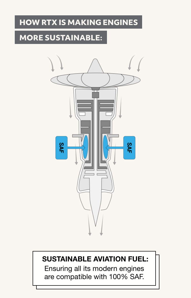 Sustainability and efficiency have long been ingrained in the culture of RTX. Those efforts are now directed toward the net-zero emission industry goal which has facilitated investments and collaborations not only across business units, but with governments, airlines and other companies.