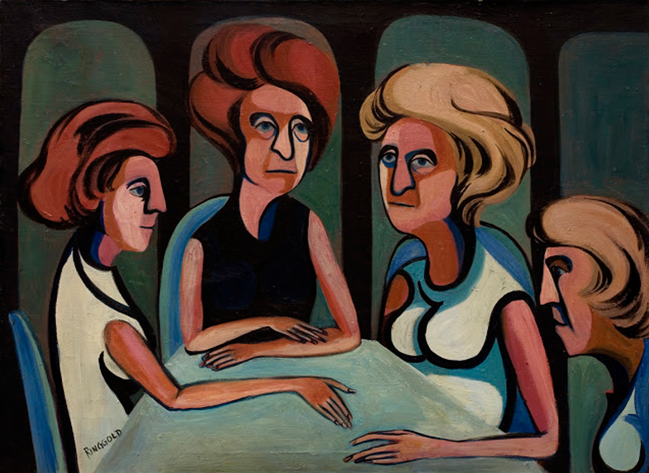 Consider “Four Women at a Table.” There is a narrative here, apparently one of idleness, alienation and mutual distrust, though the picture doesn’t make it explicit. But there is also a tendency to foreground geometries that carry emotional weight, the angles and arcs of looking at or past one another, and the hierarchies of height and placement of the faces within a confined frame. The heads owe something to Picasso and even more to the abstracting lines and planes of Matisse, whose green facial shadows seem to have inspired Ringgold to create analogous blue ones in these first years of her career.
