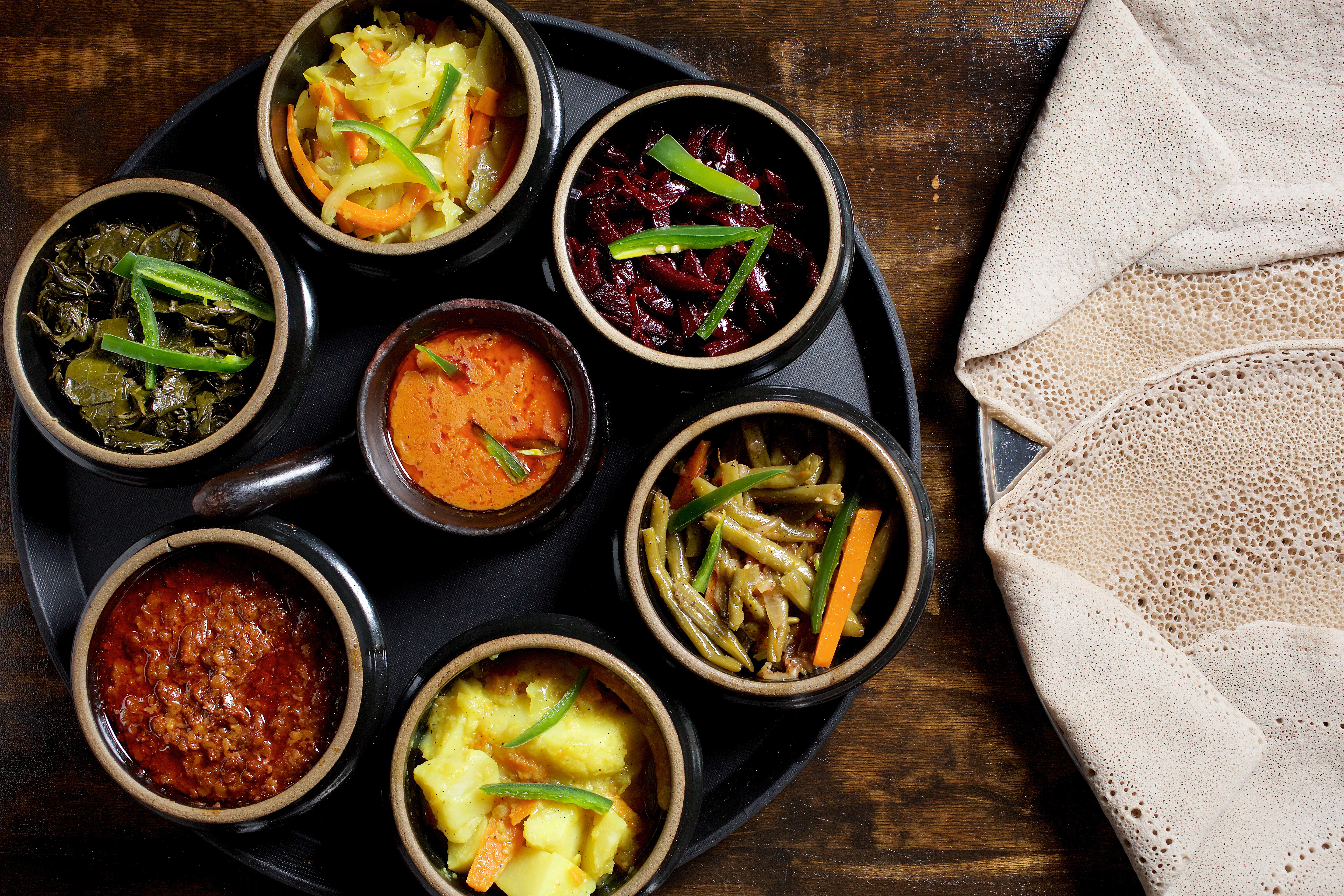 I like to start with the vegetarian combo, a platter that allows you to sample each of the seven outstanding meatless dishes on the menu. Your server will spoon every preparation onto an injera-covered platter, one by one by one, an unusual act of tableside drama that allows you to savor the full spectrum of colors and aromas that slowly assemble before your eyes. Dark lacquered strips of sweet beet root. Red lentils simmered until they sting with the house-blended berbere spices. Honey-colored cabbage softened and scented with garlic and ginger. Collard greens braised until the toothsome leaves are coated with a liquid so savory, you’d swear the kitchen threw a ham hock in the pot.