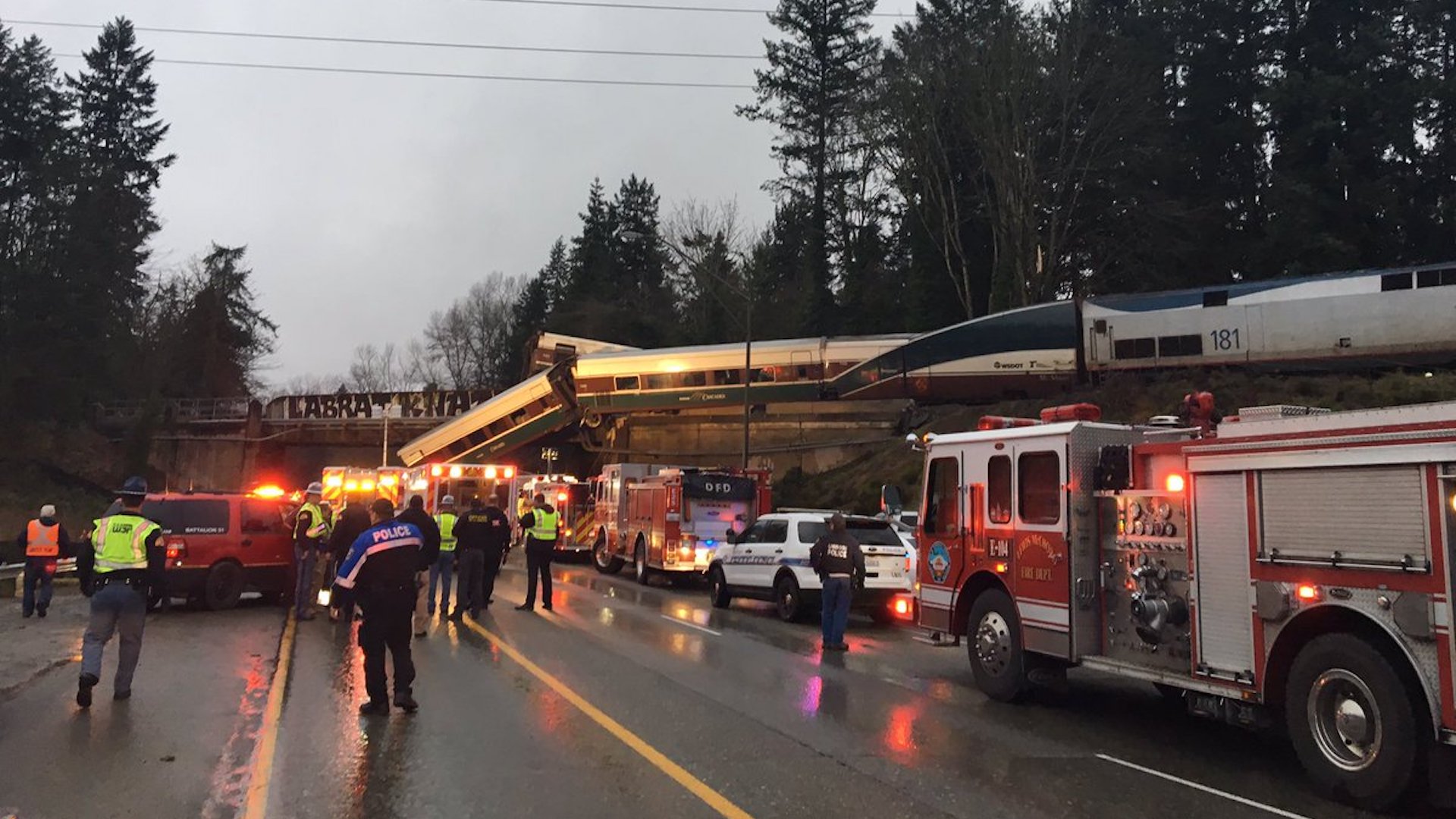 The train derails off an overpass crossing Interstate 5.
