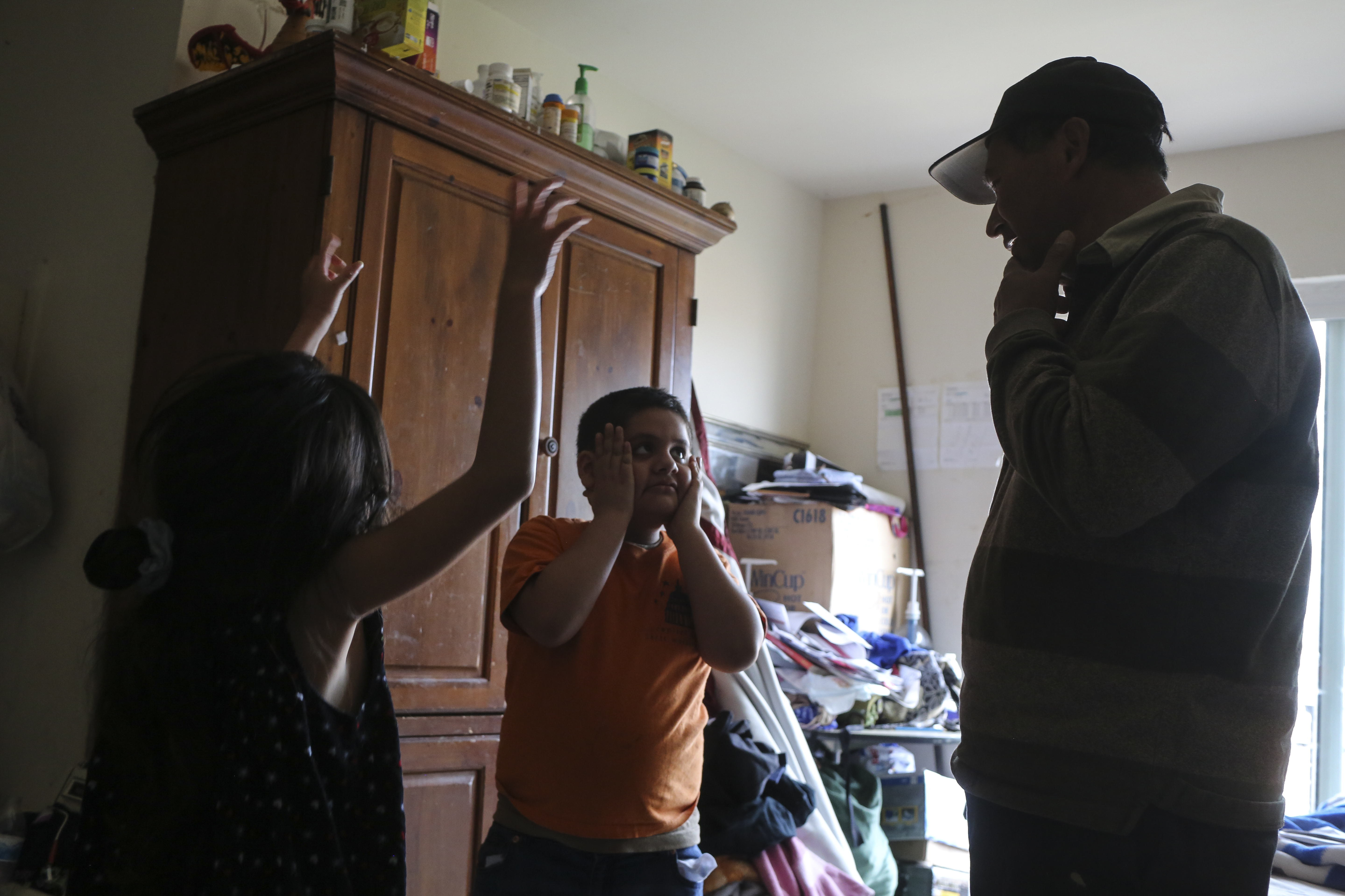 The walk was the first time in days that Nataly and her brother, Kenny — both born in the United States — had been outside. Dressed in a flowery print and plastic pearls, Nataly chased her sibling around as their parents talked about the pandemic.