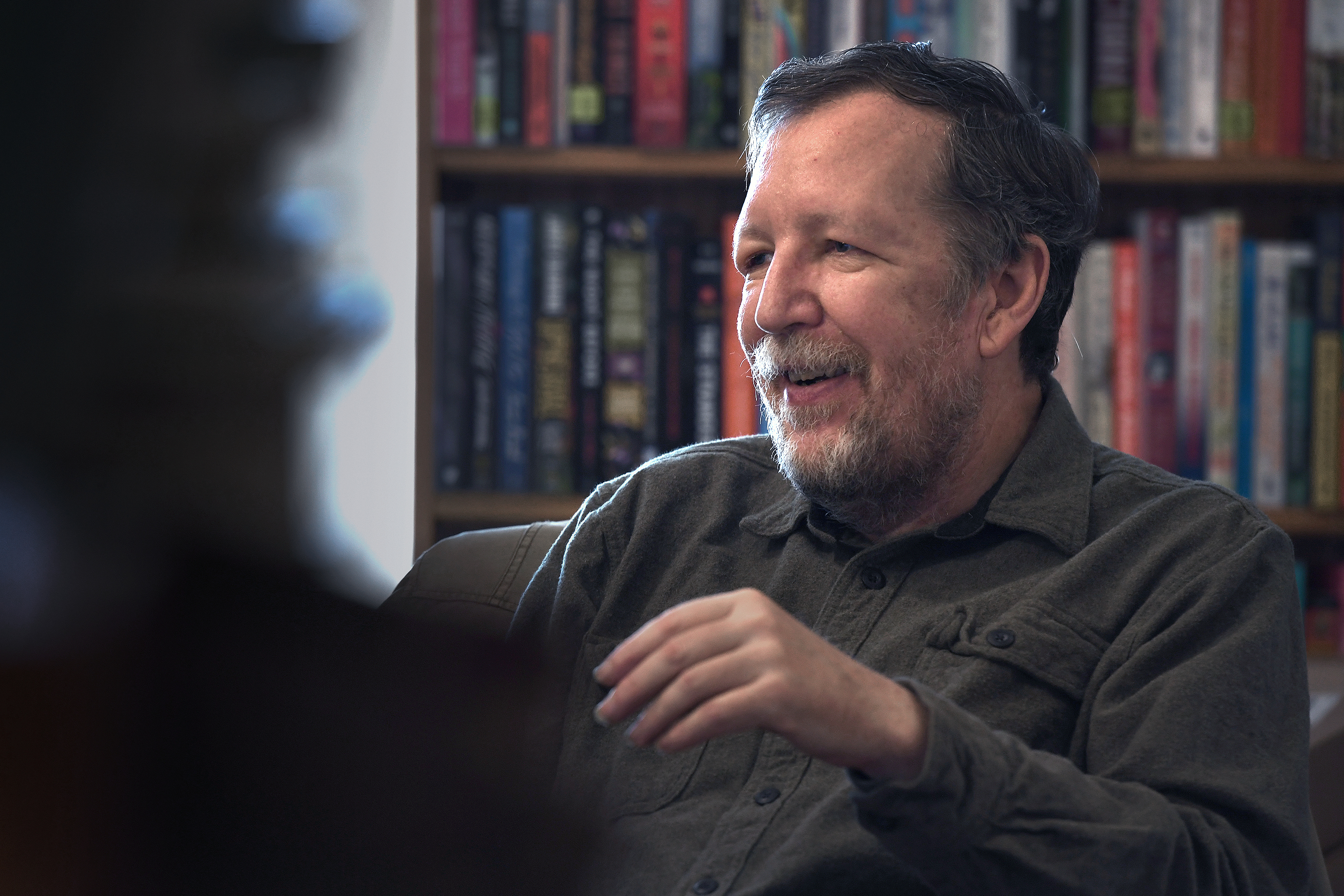 As they stood at the counter chatting, a pile of books and papers stacked up behind Darby tumbled over. There’s probably a metaphor lurking there — the crumbling of books, a man down on his luck.
