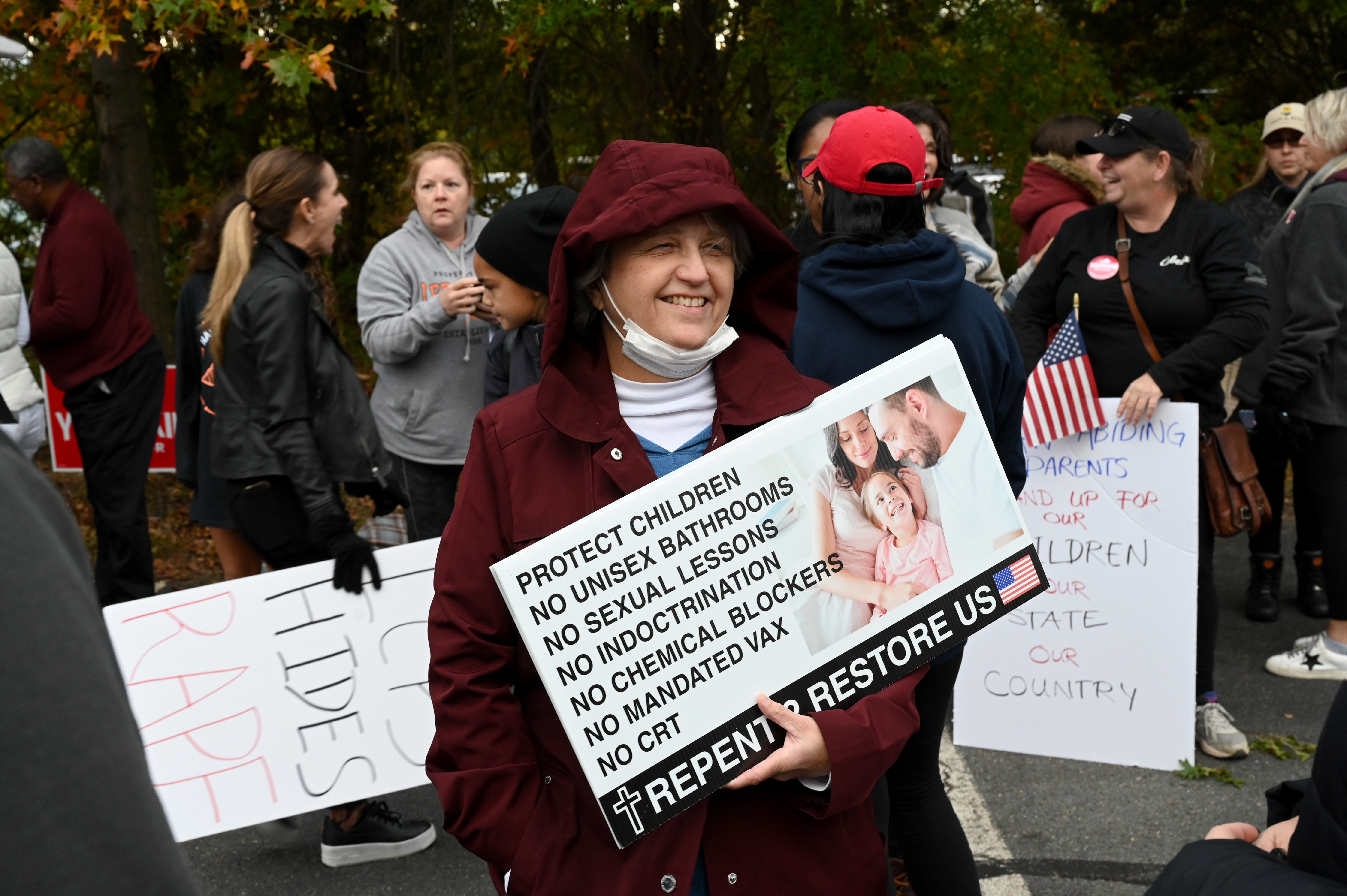Elsewhere in the ballroom, Eric Schnabel gripped a “Parents for Youngkin” sign as he awaited the election results. Schnabel, who recently retired from the Army after serving in Iraq and Afghanistan, said the chaotic pullout from Afghanistan under Biden infuriated him, turning him off to Democrats. He was also put off by what he called the party’s “divisive” focus on race, including its support for removing Confederate monuments. He said he believed those should have been left in place as a “stark reminder to never go down that road again.”