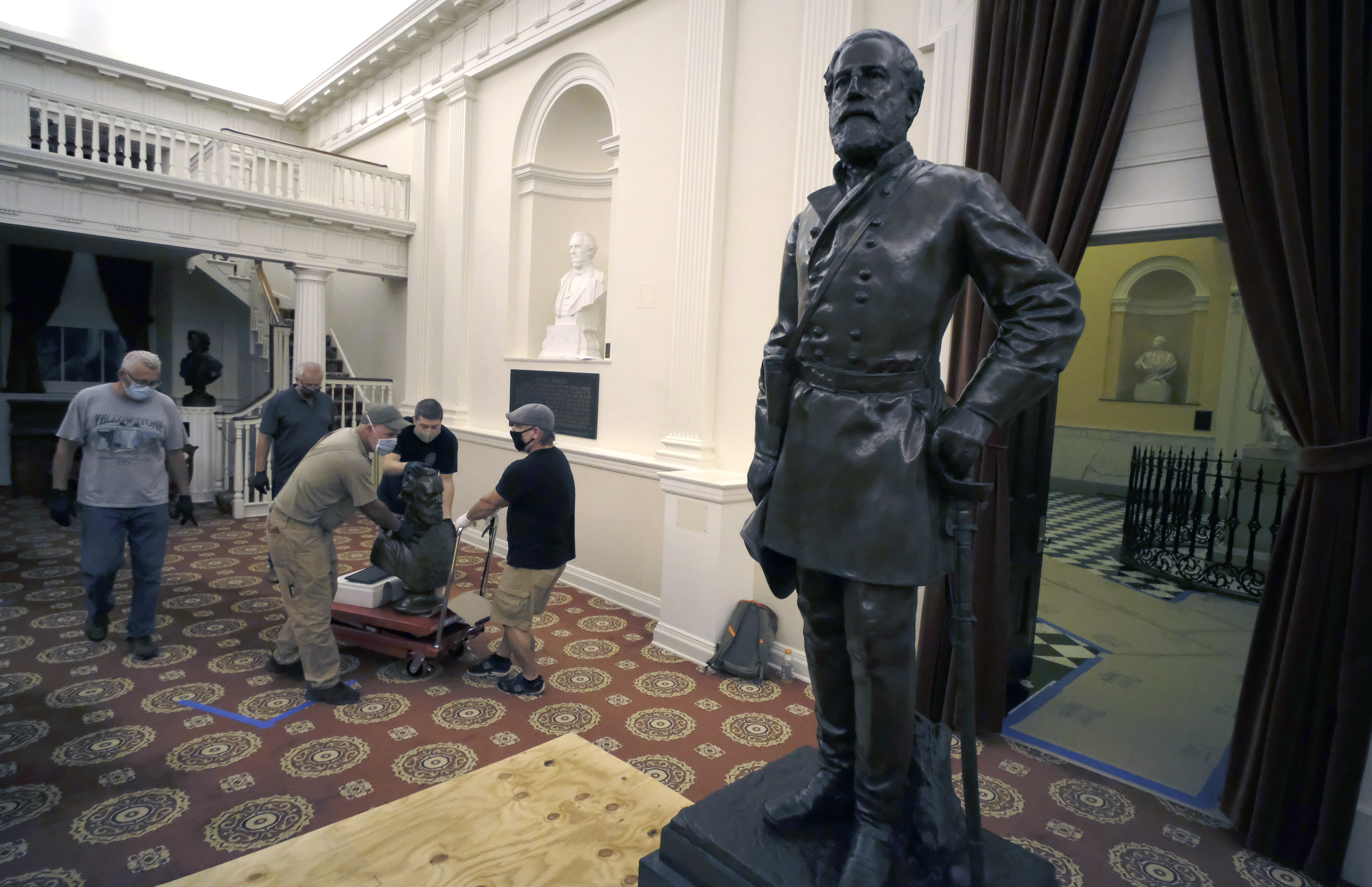 RICHMOND — Workers wielding power tools and huge rolls of bubble wrap carted a life-size statue of Gen. Robert E. Lee and busts of seven of his Confederate colleagues out of the Virginia Capitol late Thursday night and early Friday morning.