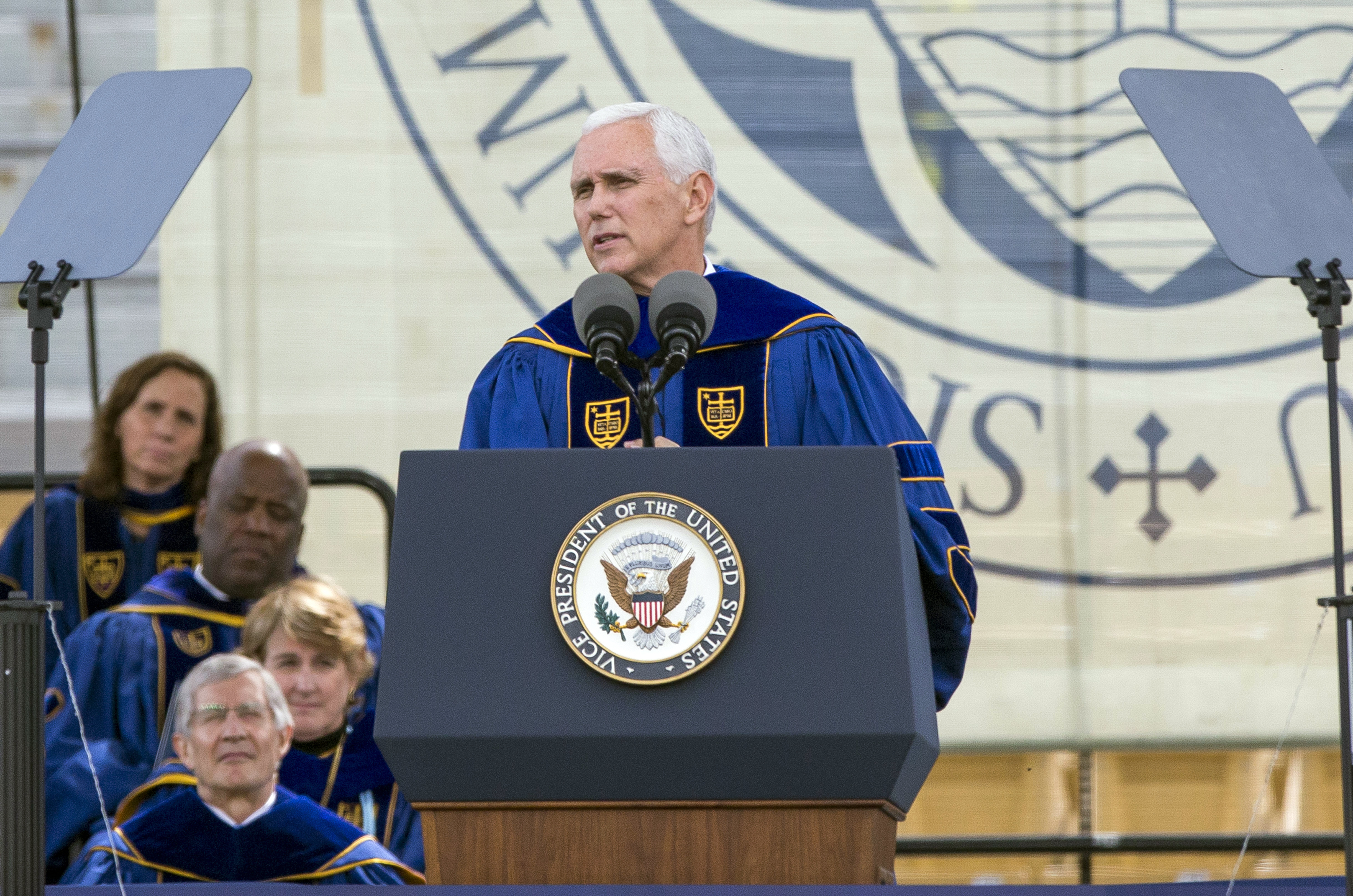 Trump’s commencement appearances have followed a similar pattern as Pence’s. Since becoming president, he has spoken at the U.S. Naval Academy and Liberty University in Lynchburg, Va., where Pence is also slated to speak next month, shortly before his remarks at Taylor University. In 2004, Trump delivered advice that now resonates with new meaning, telling graduating seniors at Wagner College in Staten Island, “If there’s a concrete wall in front of you, go through it.”