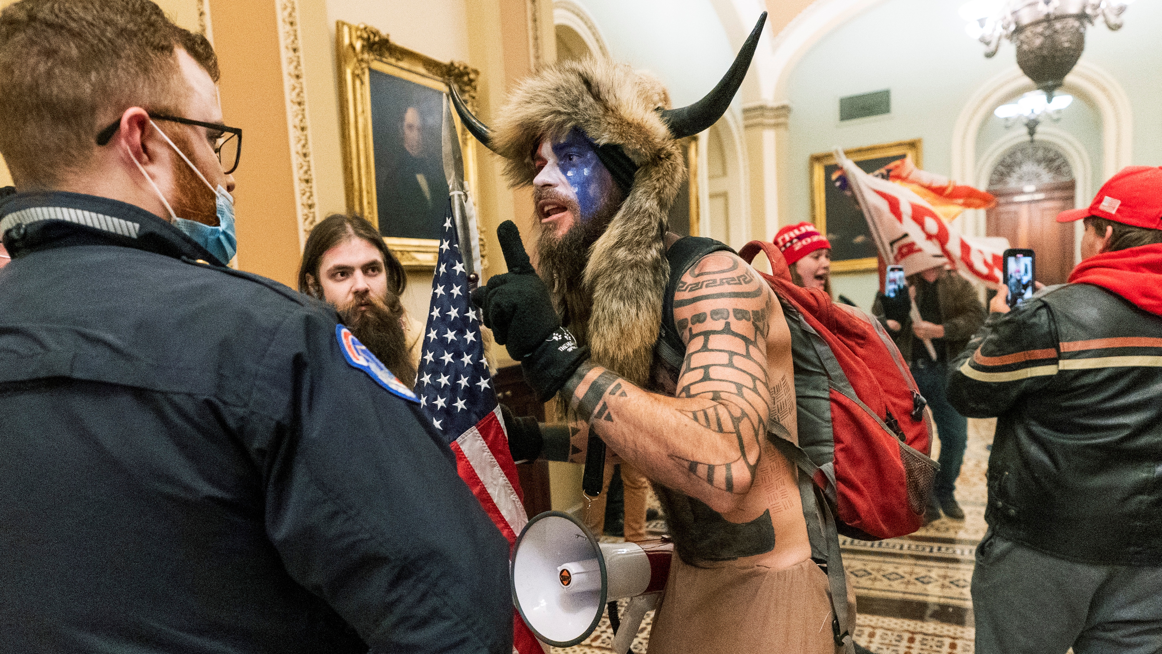 Video shows Chansley leading the breach of the U.S. Capitol while holding a six-foot pole topped with a spear tip, authorities said. Prosecutors added that Chansley forced his way into the Senate chamber, where he sat in Pence’s chair and left a note declaring “ITS ONLY A MATTER OF TIME JUSTICE IS COMING!”