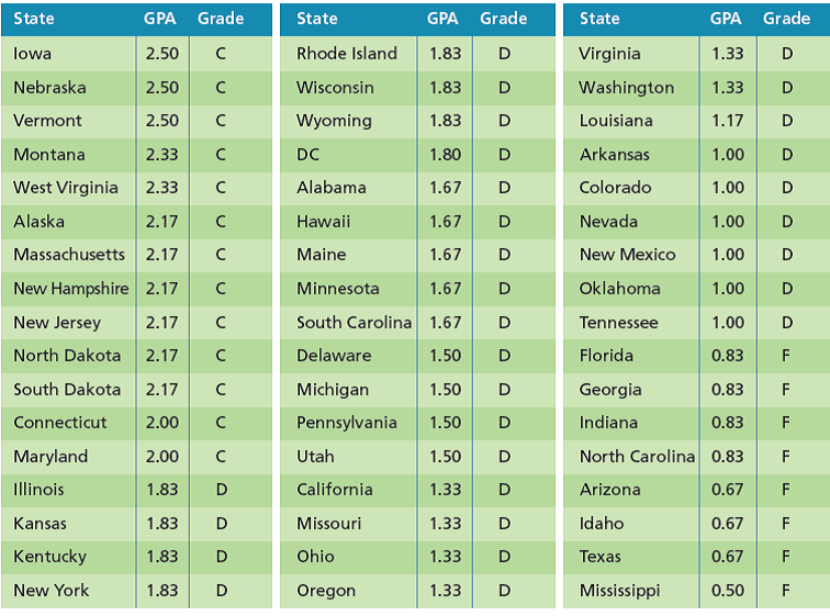 Specifically, the reports looks at how states approach high-stakes standardized testing and school finance as well as how much they promote teachers as professionals and resist privatizing public education. How states spend taxpayer money is another criterion, as is whether states promote policies that affect the income, living conditions and governmental support for students to give them all a chance to succeed in school. Some states earned A’s in a category or two but none earned higher than an overall C. You can see the breakdown below.