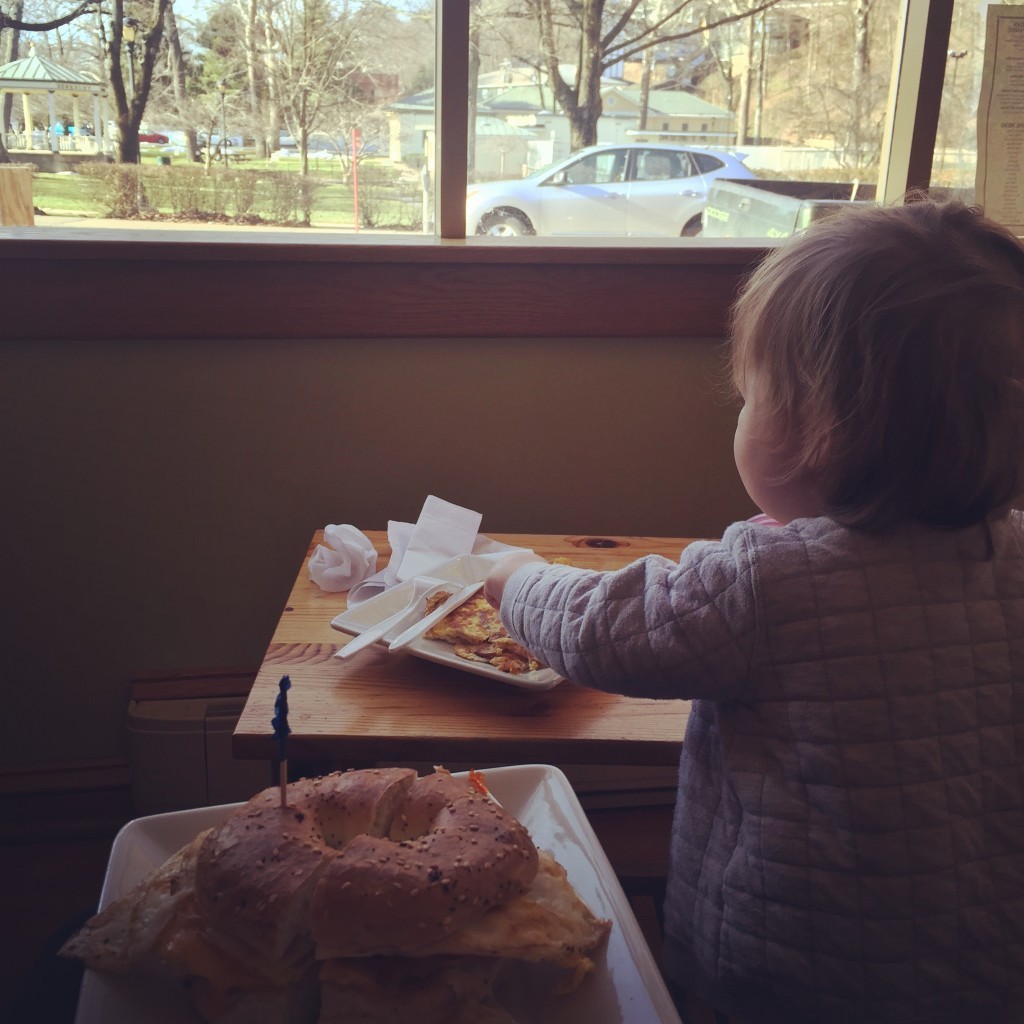 But, even in the most hospitable of environments, the rules for dining out with a toddler still apply. If our food takes more than 40 minutes to arrive, all bets are off. We made it through that particular meal not because of the waitress’s kid-friendliness, nice as she was, but because they had bread to nibble on and an entryway with plenty of leaves and sticks on the floor for emergency entertainment.