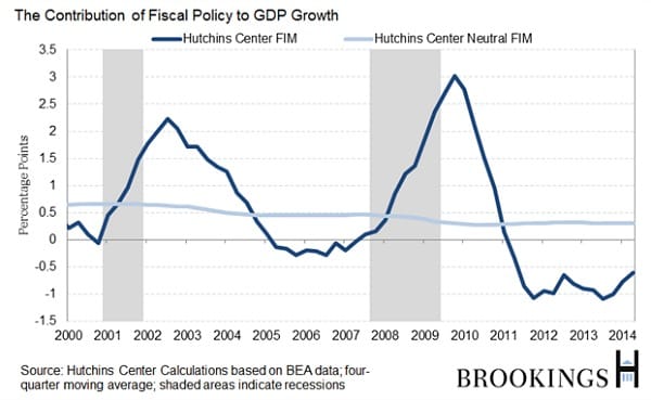 And, as you can see above, all this austerity has been hurting GDP growth since 2011. It shows the Hutchins Center's new "fiscal impact measure," which looks at how much total government tax-and-spending decisions have helped or harmed growth. The dark blue line is what policy has actually done, and the light blue one is what a neutral policy would have done. So, in other words, if the dark blue line is below the light blue one, like it has the last three years, then policy has subtracted from growth.