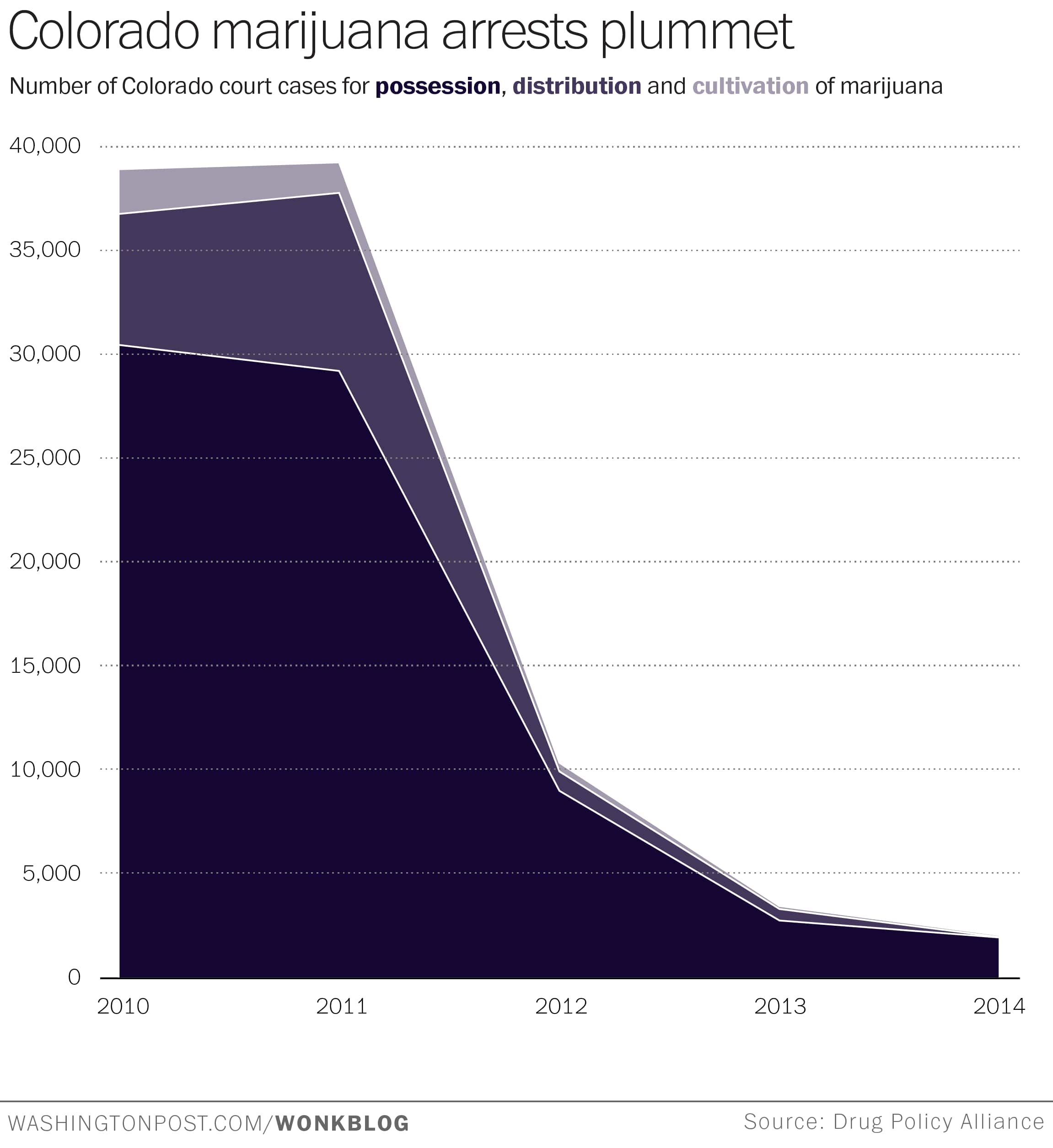 The total number of marijuana court cases fell from 39,027 in 2011 to 2,036 cases in 2014. Those 37,000 fewer cases represent a savings of untold millions of dollars in court costs and law enforcement fees. They represent 37,000 fewer people who have to deal with the stigma and financial burden of an arrest and possible conviction. They represent countless police man-hours able to be devoted to other tasks.