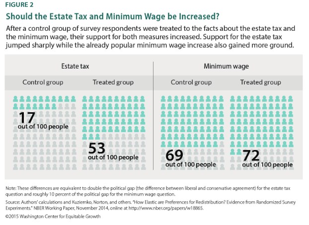 The respondents who viewed the inequality presentation were more likely to favor two policies that Democrats tend to favor to combat inequality: raising the minimum wage and raising the estate tax. They were no more likely to favor several other government-centric inequality proposals, including expanding the federal supplemental nutrition program that most Americans call food stamps, and expanding the Earned Income Tax Credit for low-wage workers.
