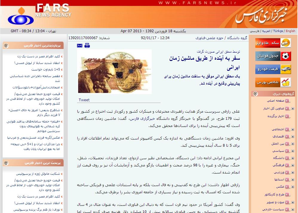 It’s too late to hush up this story, though. As Entekhab, another Iranian news service, notes before its own interview with the alleged time-machine inventor, the story blew up on social media even as Fars deleted it.