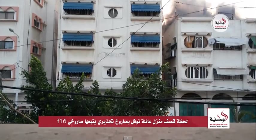 "Knocking the roof" is the Israeli military practice of warning the residents of a building they are targeting that they should get out. Warnings can come via a phone call or a warning missile: In this case, the occupant of the house, Samir Nofal, received both, Watania reports (it's worth noting that the video's description says the second missile strike came five minutes after the first, so the footage may have been edited). The practice has become one of the most controversial aspects of the current conflict.