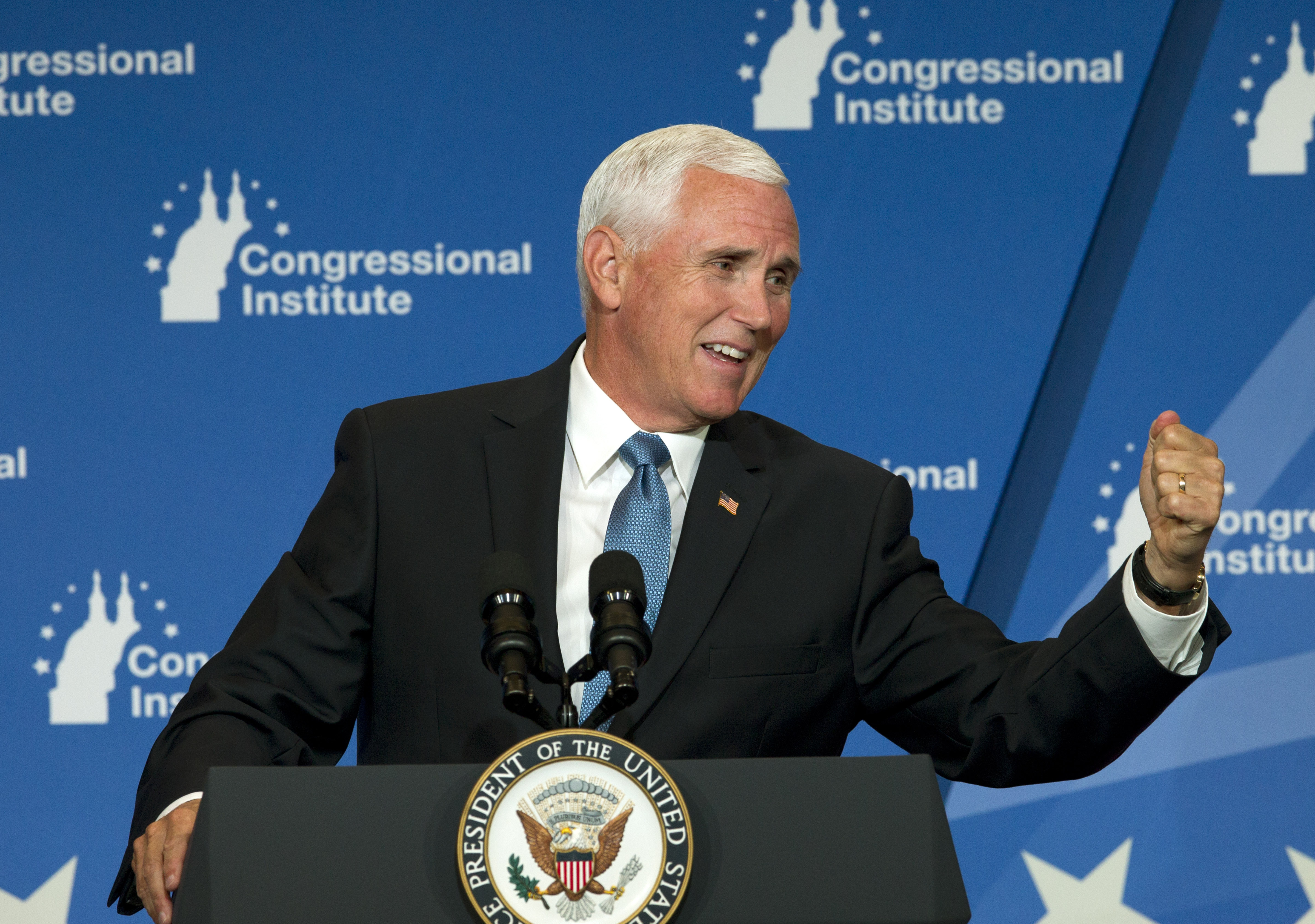 The vice president did not mention a bite when he spoke of his visit with American Pharoah later in the day at an event promoting the Trump administration’s tax cut bill.