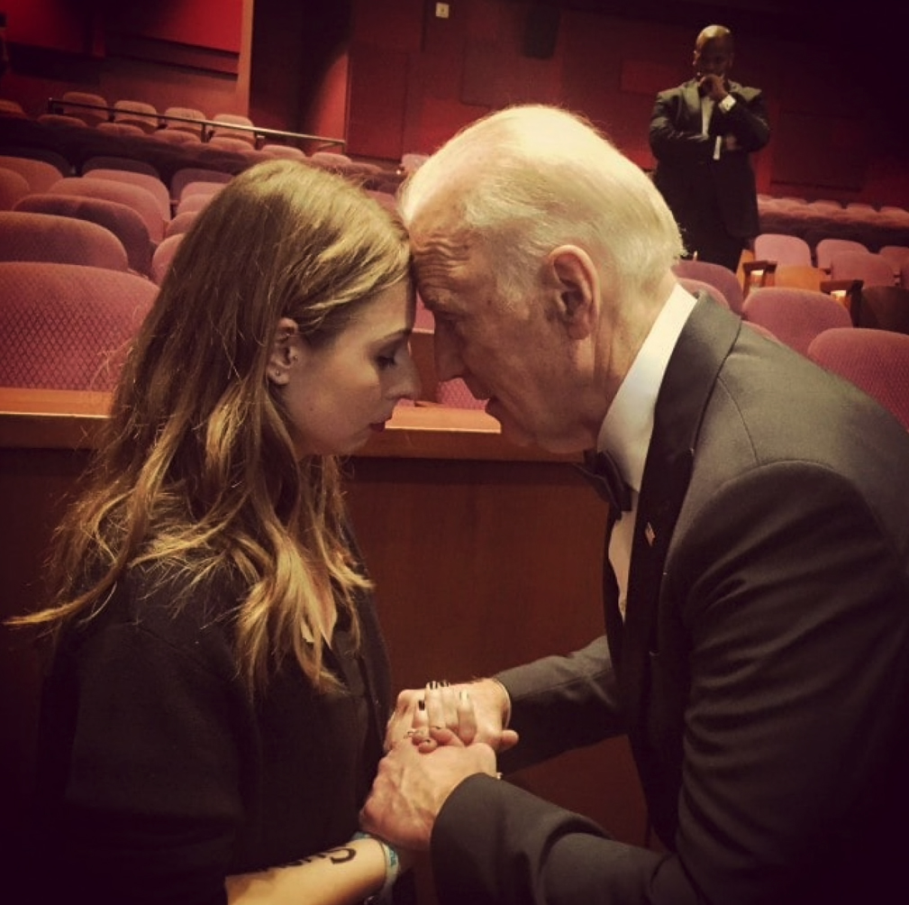 Karasek said as she met Biden after the ceremony, she was thinking about a college student who had been sexually assaulted and recently died by suicide. She decided to share the story with the then-vice president, and Biden responded by clasping her hands and leaning down to place his forehead against hers, a moment captured in a widely circulated photograph.