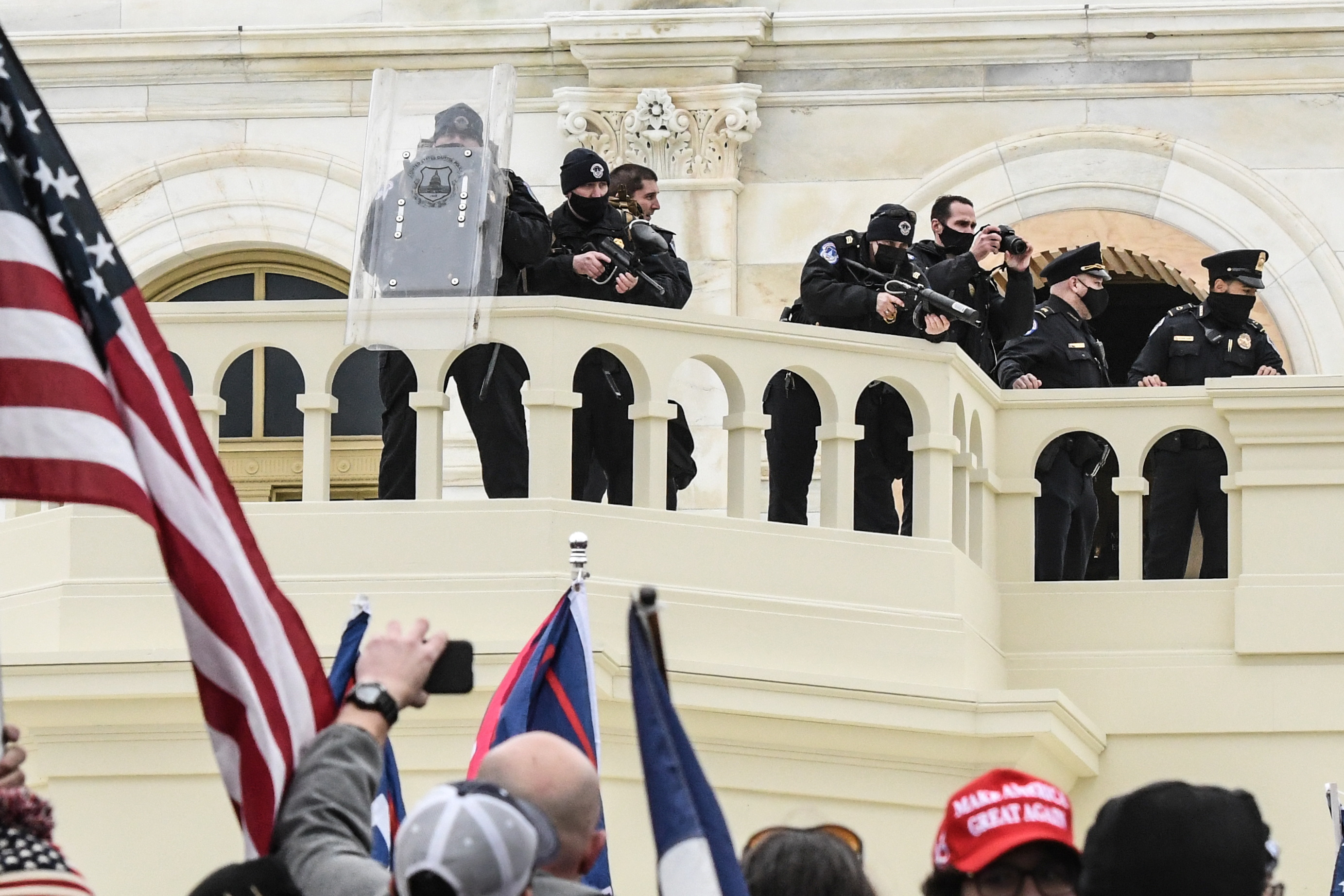 A video of the moment shows the picture was taken just inside a security checkpoint. An alarm, perhaps from a nearby magnetometer, blares as men from the crowd appear to keep entering the door without police checking for weapons. The photographer said he thought the image was taken in a doorway near the northwest corner of the Capitol.