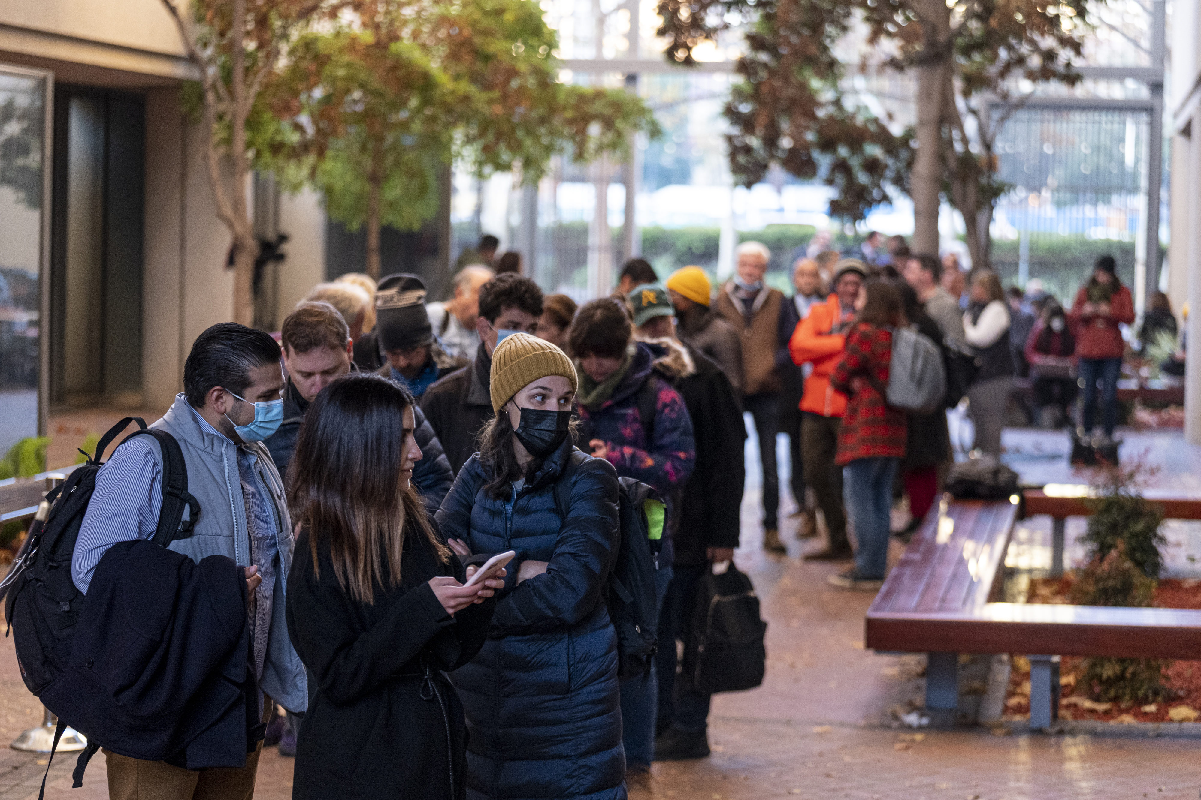 The hours-long line isn’t so bad, said Spillane and Dobrin, the couple traveling from San Rafael. People chat and swap stories or predictions for the day. Some read true-crime books or do work on their computers. Others find a quiet place to sit and curl up in their big coats and scarves during the chilly mornings. Some make Starbucks runs for the section of line around them while others hold their place.