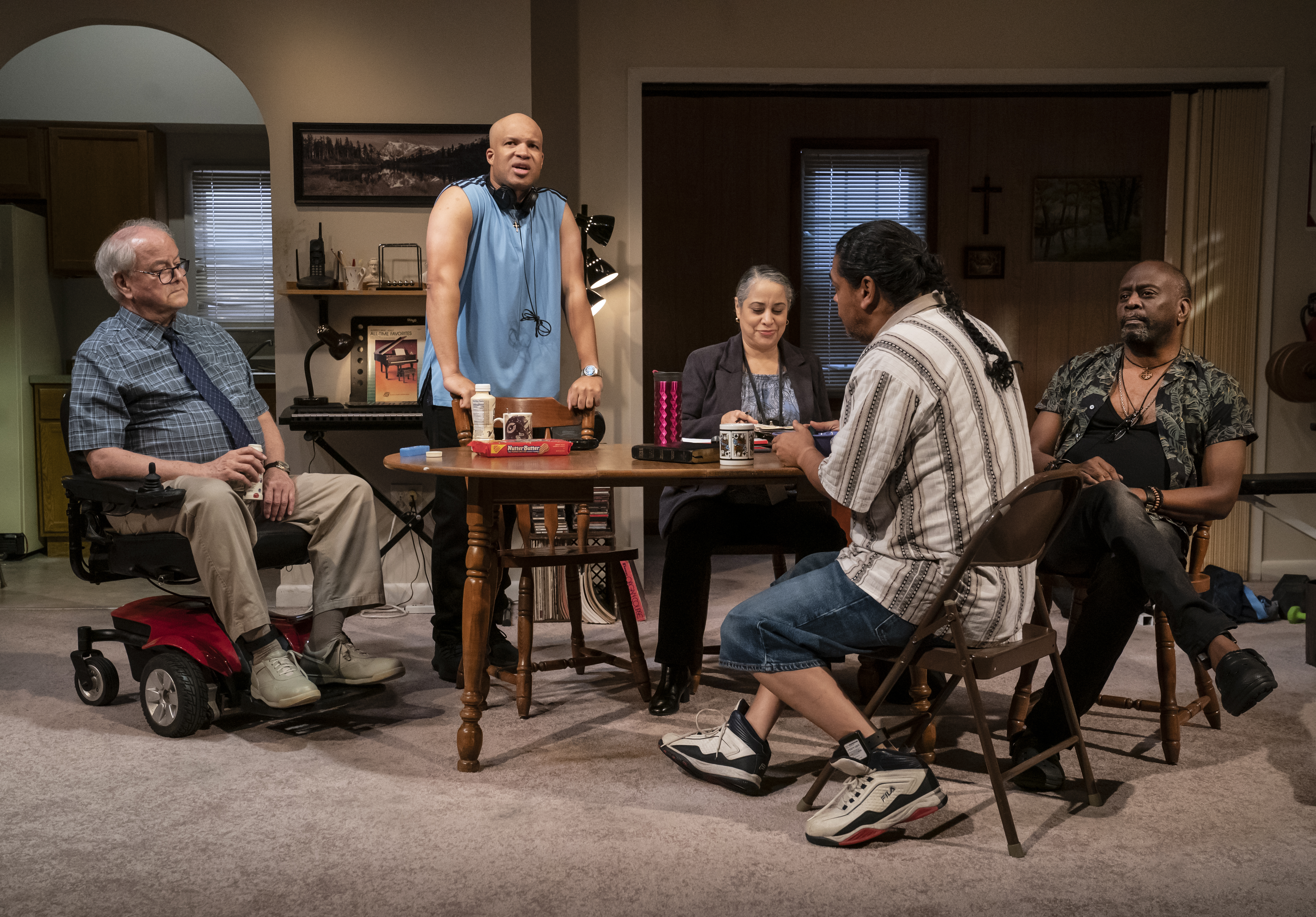 He’s loaded the dice to some degree in “Downstate,” as the predators who’ve completed their prison terms are depicted not as monsters but rather as complicated, troubled souls. Felix (Eddie Torres) is a taciturn loner, keeping to himself in a screened-off alcove. Gio (Glenn Davis) is a smarmy operator with a job at a local office supply superstore. Dee (K. Todd Freeman) is a clearheaded ex-stage performer who is fiercely protective of the oldest resident, wheelchair-bound Fred (Francis Guinan), a onetime piano teacher of serene disposition.