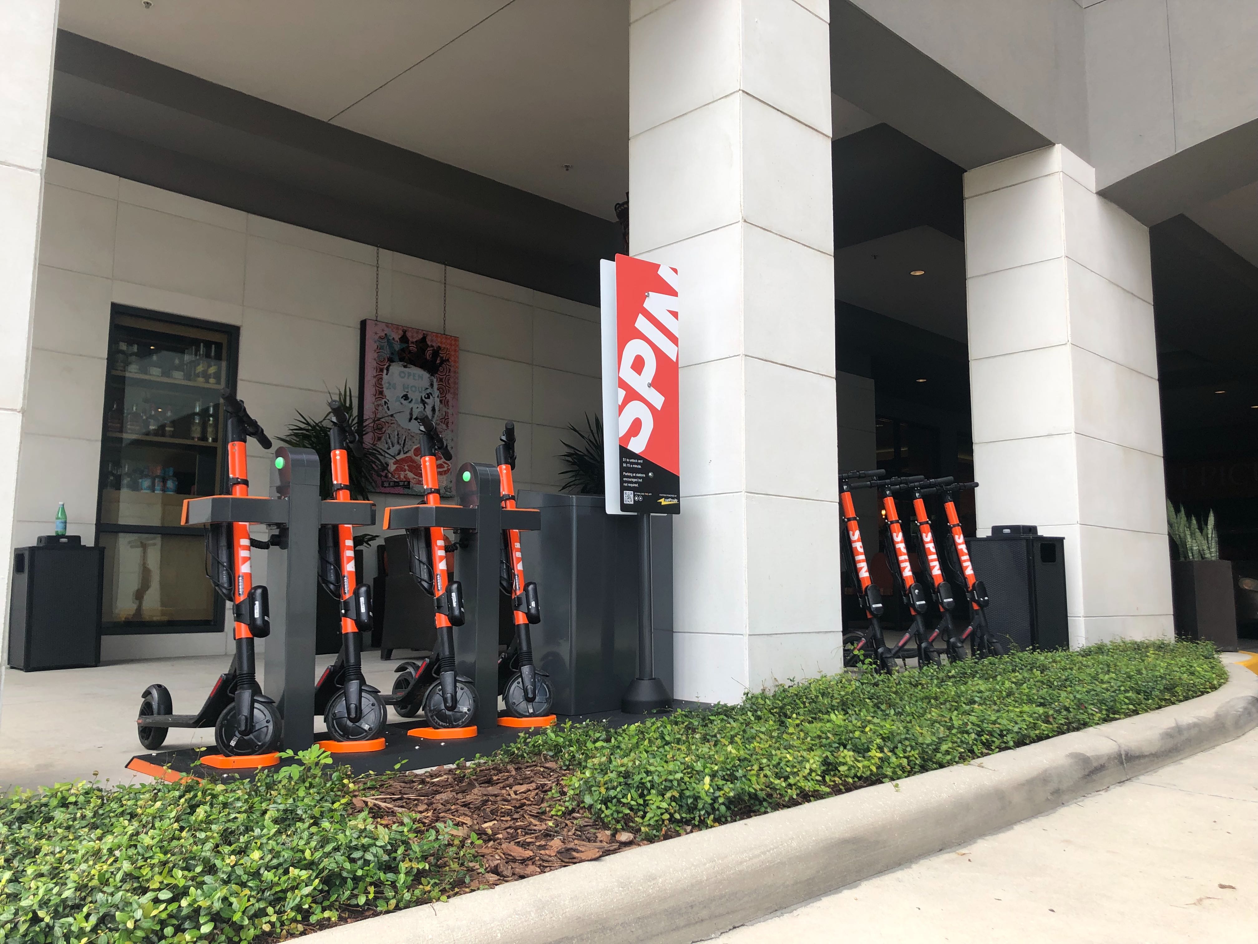 The stations will initially be powered by replaceable batteries, Winston said, but plans are to transition this fall to a solar-powered system. They will be placed on private property — including at office and residential buildings — where owners have agreed to have them. The stations will show up in the Spin app so riders can easily locate them for scooter pickup or drop-offs.
