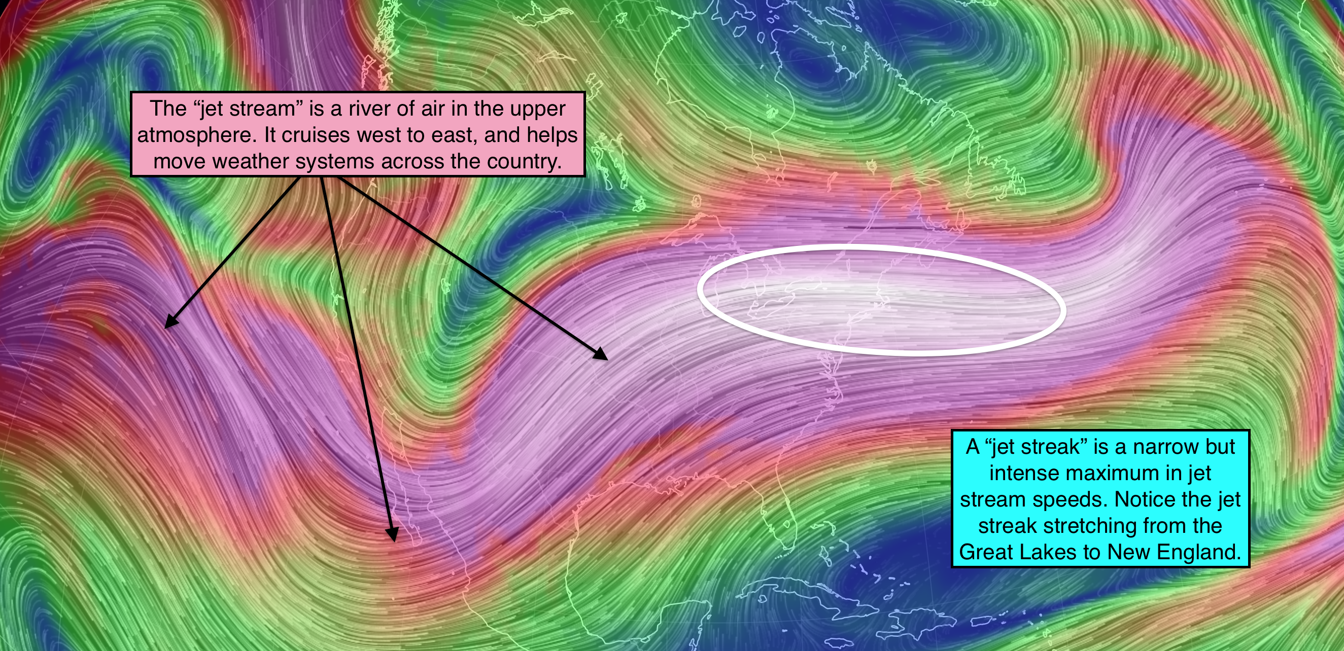 The 250 millibar level generally tends toward 30,000 feet to 35,000 feet. That’s about the same height at which commercial planes fly. Unsurprisingly, the jet stream can have big implications on how quickly aircraft reach their destination.