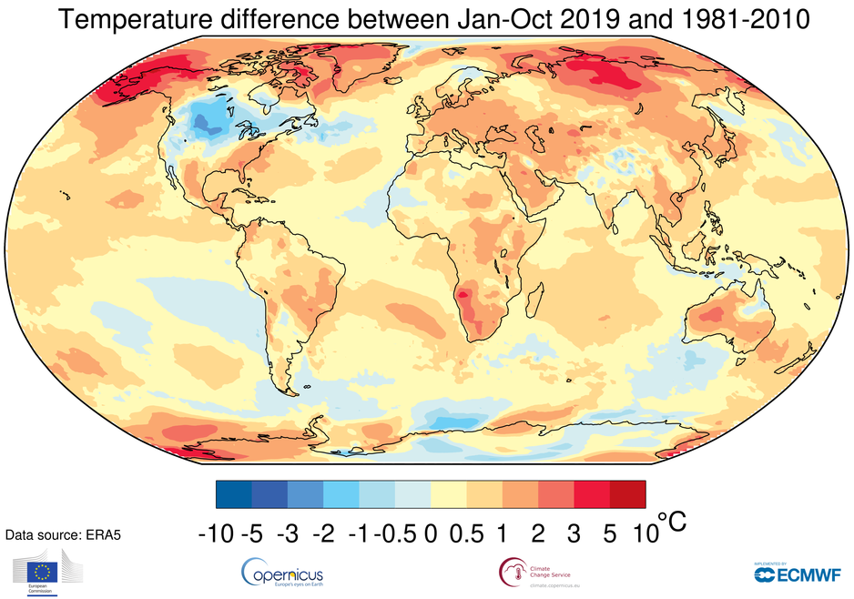 The past month tied for the warmest November on record globally, according to the Copernicus Climate Change Service, in a statistical dead heat with November 2016 and just behind November 2015. The global average temperature in 2019 (January through October) was about 1.96 degrees Fahrenheit above the preindustrial period.