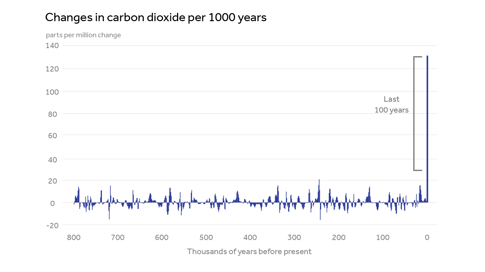 Why? Time chunks 1,000 years long can’t capture the speed of the modern carbon dioxide jump, almost all of which has taken place in the past century. If we could make a 100-year skyscraper plot, its appearance would be even more stark. It would look a lot like the 1,000-year skyscraper, but with the average change per period — except the last spike — divided by 10, creating an even bigger contrast. Unfortunately, data gaps across most of the record are still too long to put confidence in a reconstruction with a 100-year resolution. Or maybe that is fortunate: The 1,000-year version looks daunting enough.