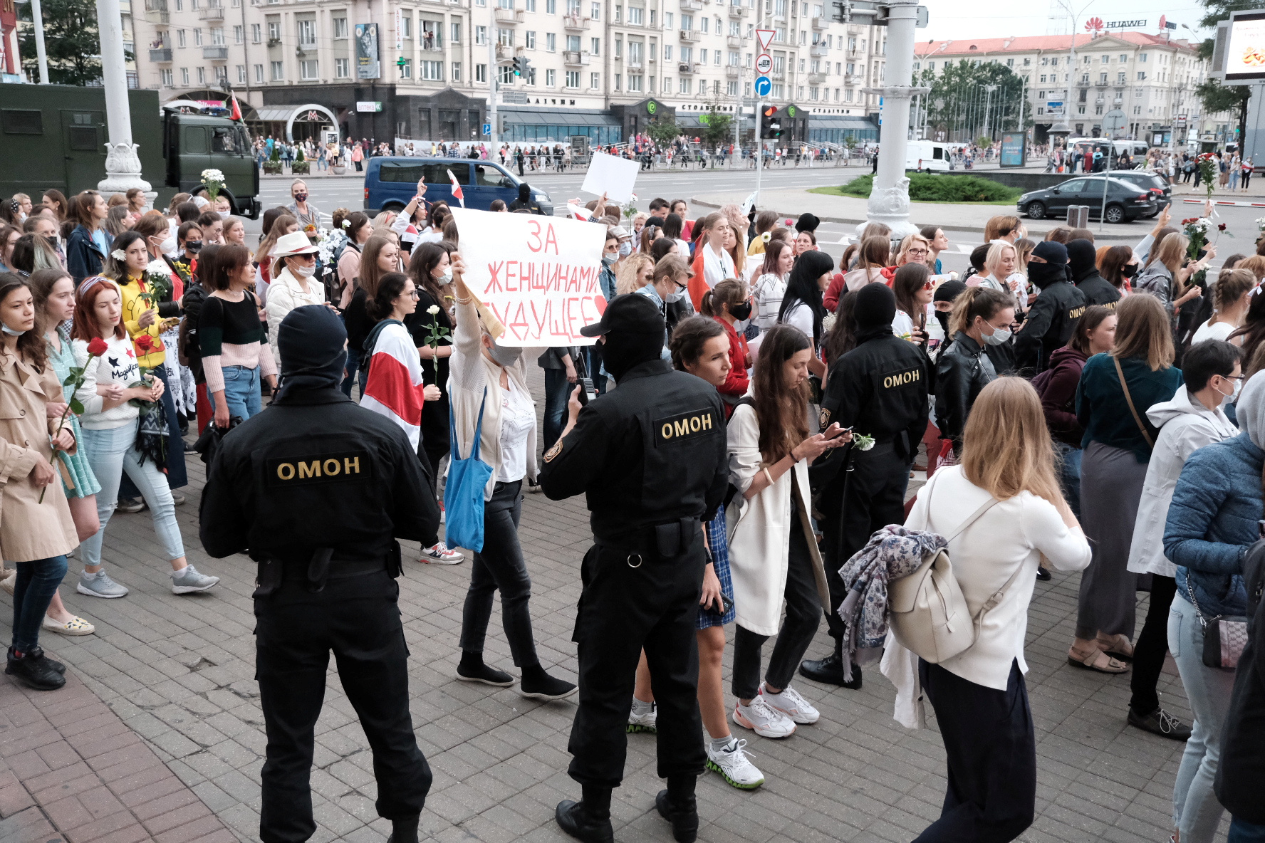 Riot police also arrested journalists covering a women’s protest march in Minsk on Saturday afternoon. Protesters wore white and red, carried white-and-red flags — the colors of the Belarusian republican flag used from 1991 to 1995 — and chanted for Lukashenko to step down after 26 years in power.